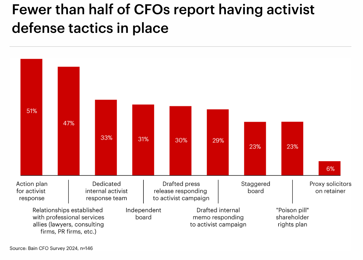 As these campaigns rise in number and aggressiveness, more companies are realizing the importance of proactive defense, primarily through robust shareholder engagement. That said, less than 50% of CFOs surveyed by Bain said they have activist defense tactics in place.
