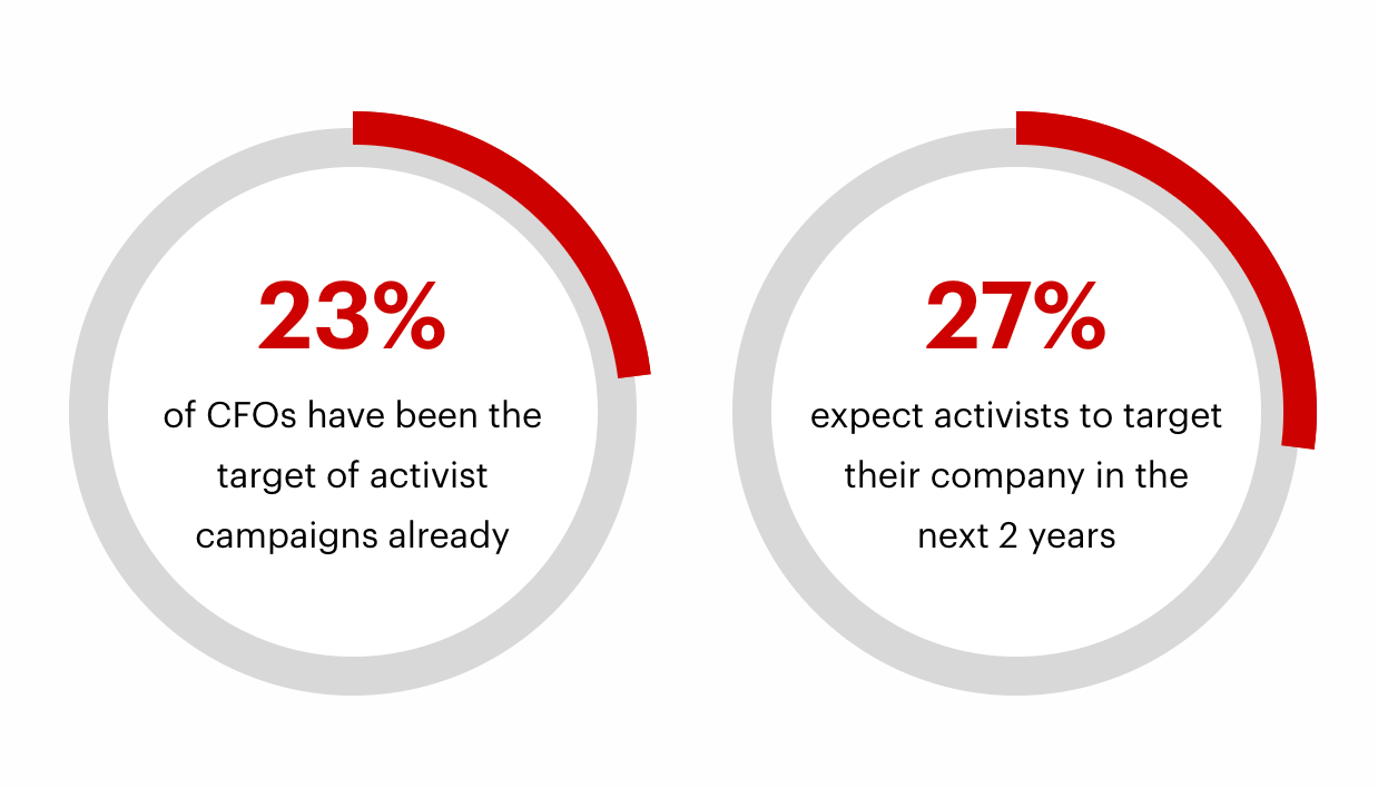 Activist campaigns are becoming more common, and CFOs are increasingly looking for ways to minimize the financial and reputational risks that these campaigns pose. Two decades ago there were 20 activist campaigns per year. That figure is now 1,000 per year. In fact, new data from Bain found that 25% of CFOs expect their company to be the target of an activist investor campaign in the next two years.
